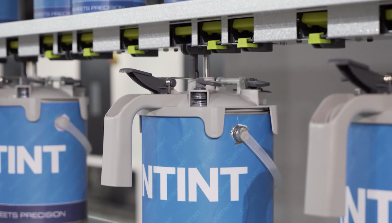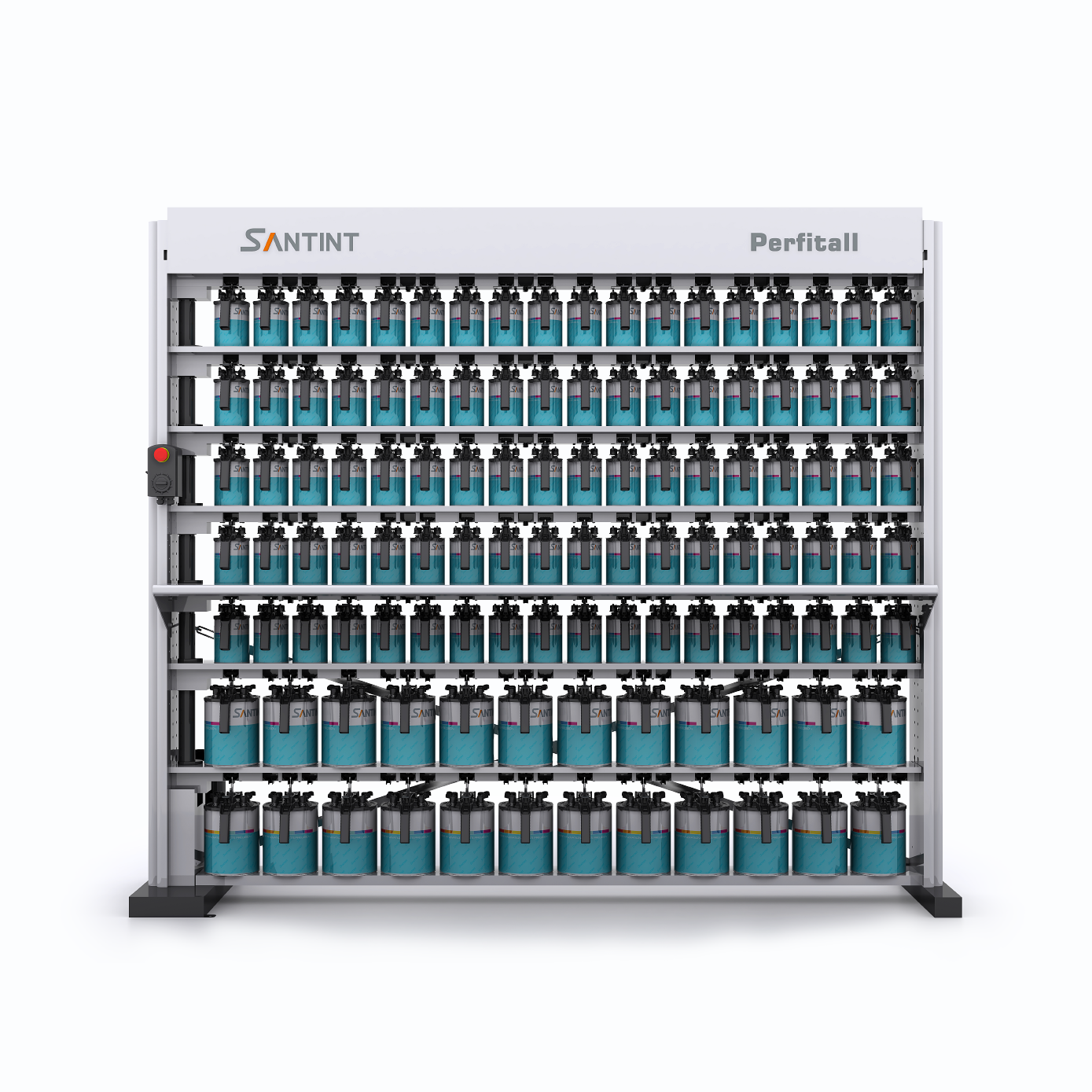 El sistema Perfitall de Santint es una solución automatizada para la mezcla y gestión de pinturas automotrices o industriales, diseñada para optimizar el almacenamiento, agitación y preparación de tintas o toners. Su diseño modular permite integrar múltiples bancos de mezcla, facilitando el manejo de diferentes líneas de pintura y mejorando la eficiencia en talleres y laboratorios.